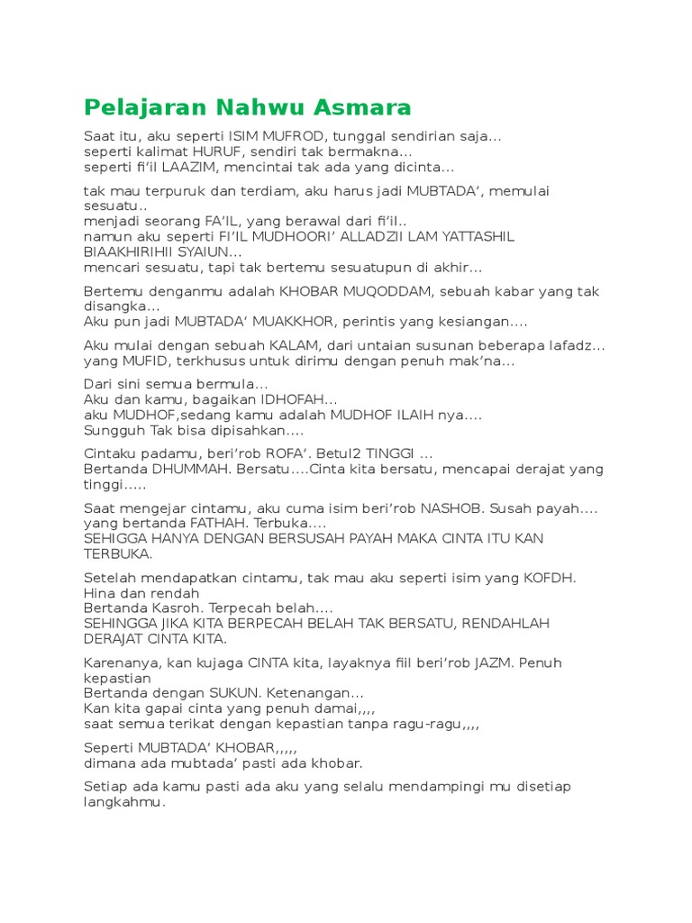 Inilah puisi cinta terbaru ala nahwiyyin. Kata cinta ilmu nahwu bahasa sunda kata cinta ilmu nahwu bahasa sunda informasi yang saat ini sedang anda cari yaitu kata cinta ilmu nahwu bahasa sunda. Jika cinta itu nahwu maka cintaku padamu akan jazm mantab sehingga aku akan sukun tenang di sampingmu selamanya seperti halnya irob jazm yang salah satu alamatnya adalah sukun jika cinta itu shorof maka kita berdua adalah wazan tafaaala.
